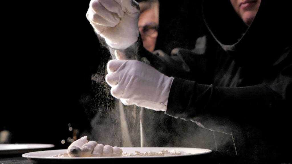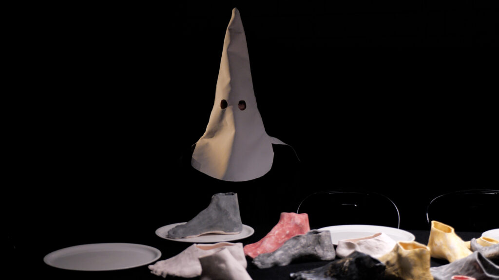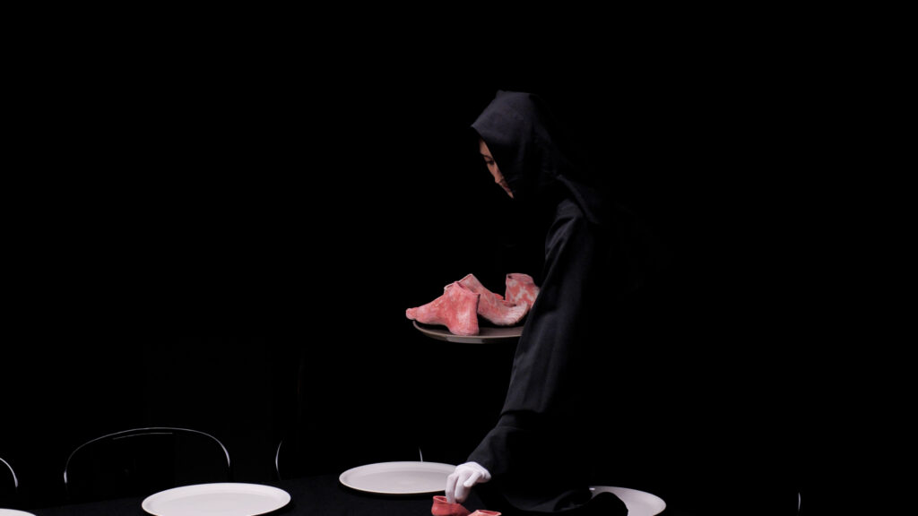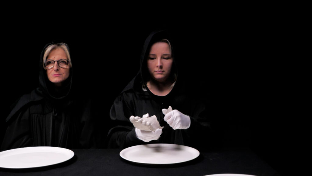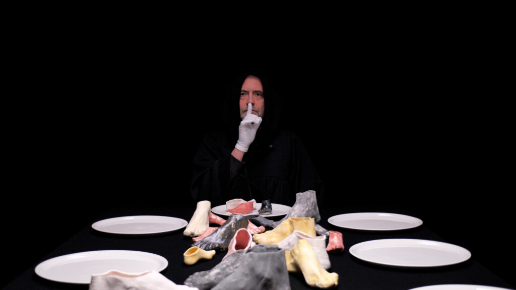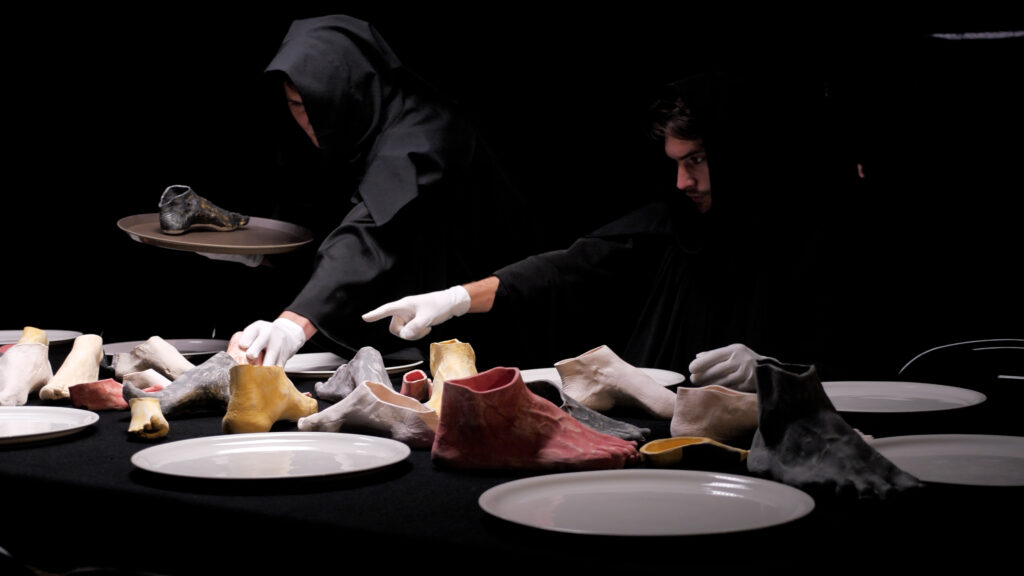 Performance, którego twórcą jest Miłosława Skoczek- Śliwińska to komentarz do wydarzeń jakie przeżywa świat od marca 2020 roku. Idea performance zrodziła się podczas pandemii jednak jego przekaz jest zdecydowanie szerszy. Artystka mówi o sztucznie skonstruowanej i narzuconej koncepcji odcięcia, izolacji człowieka, manipulacji rzeczywistością, informacjami, które spowodowały eksplozję strachu, przerażenia i lęku. A gdy pojawia się strach i lęk na arenę wkracza agresja. Wtedy traci się człowieczeństwo, akceptację dla inności, bez względu czego dotyczy, czy jest to kolor skóry, odmienne zdanie w kwestii przekonań politycznych, religijnych czy też orientacji seksualnych. Zabrano Ludziom poczucie stabilizacji, bezpieczeństwa, prawo do decydowania o sobie samym, zabrano wolność. Osią pracy jest konsumpcja stóp, głównego dania, będących symbolem człowieka. „Pożeranie” może przyjąć różne formy, może to być system, który narzuca standardy życia poprzez fałszywe informacje, czy też podprogowe kodowanie stylu życia.